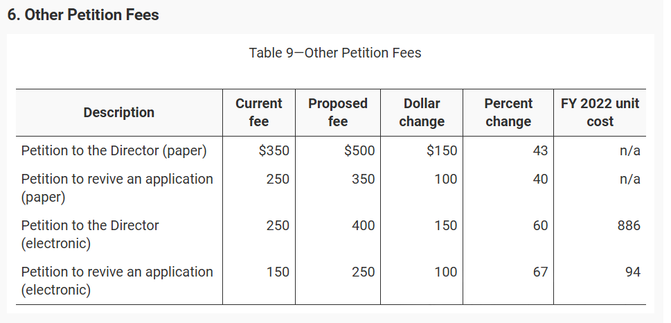 8. Petition to Director(即向商标局局长提出特别请求):从每标每类250美元涨到每标每类400美元;